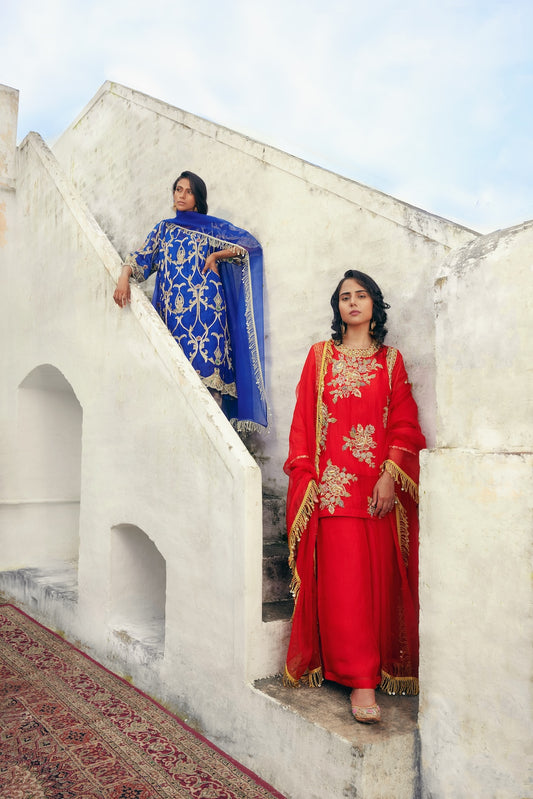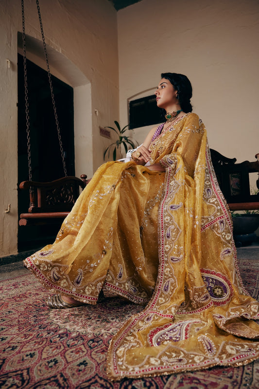 Drawing inspiration from bustling conversations, soulful Sufi melodies, and the electric aura of burgeoning romantic rendezvouses in Lahore’s ancient havelis, Adabi Angan unveils a vibrant love of festive celebration. Within its folds of opulent velvets and resplendent Benarasi silks, vintage-inspired zardozi, dabka, and gota embroidery intertwine, creating a kaleidoscope of joyous revelry.