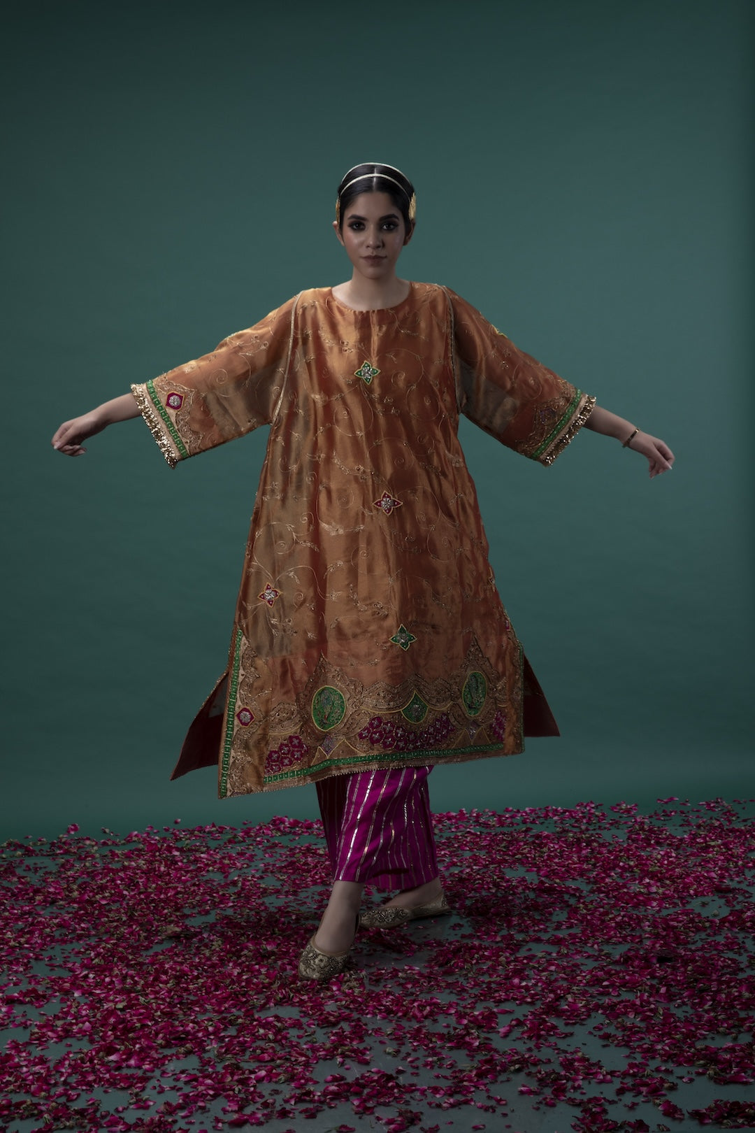 Dull orange hand embroidered tissue choga set with rani chanderi gota striped pants.